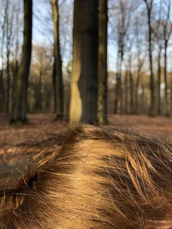 You smoothly straight hair shiny blond in the late sunny winter afternoon and deciduous pine forest.